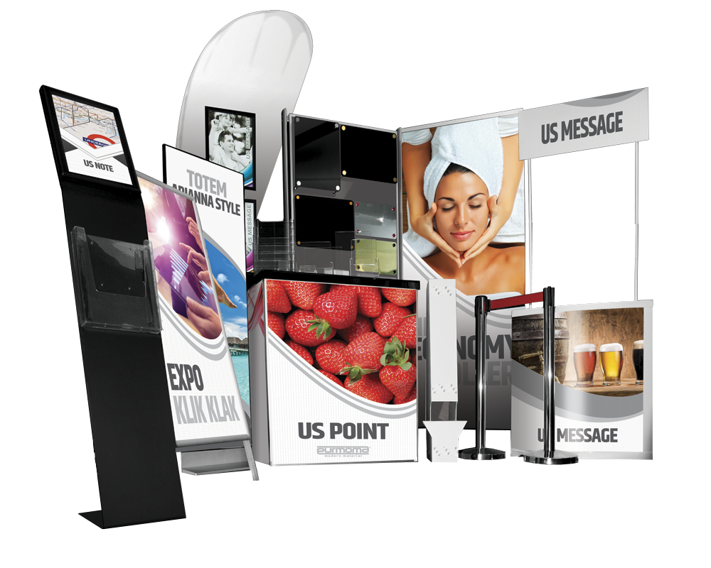 Progettiamo e realizziamo le grafiche per espositori totem pubblicitari, display box per cataloghi e dépliant, targhe, espositori modulari, espositori da terra, banner, bandiere espositive, strutture pubblicitarie da esterno, e diverse altre soluzioni di arredo stand.